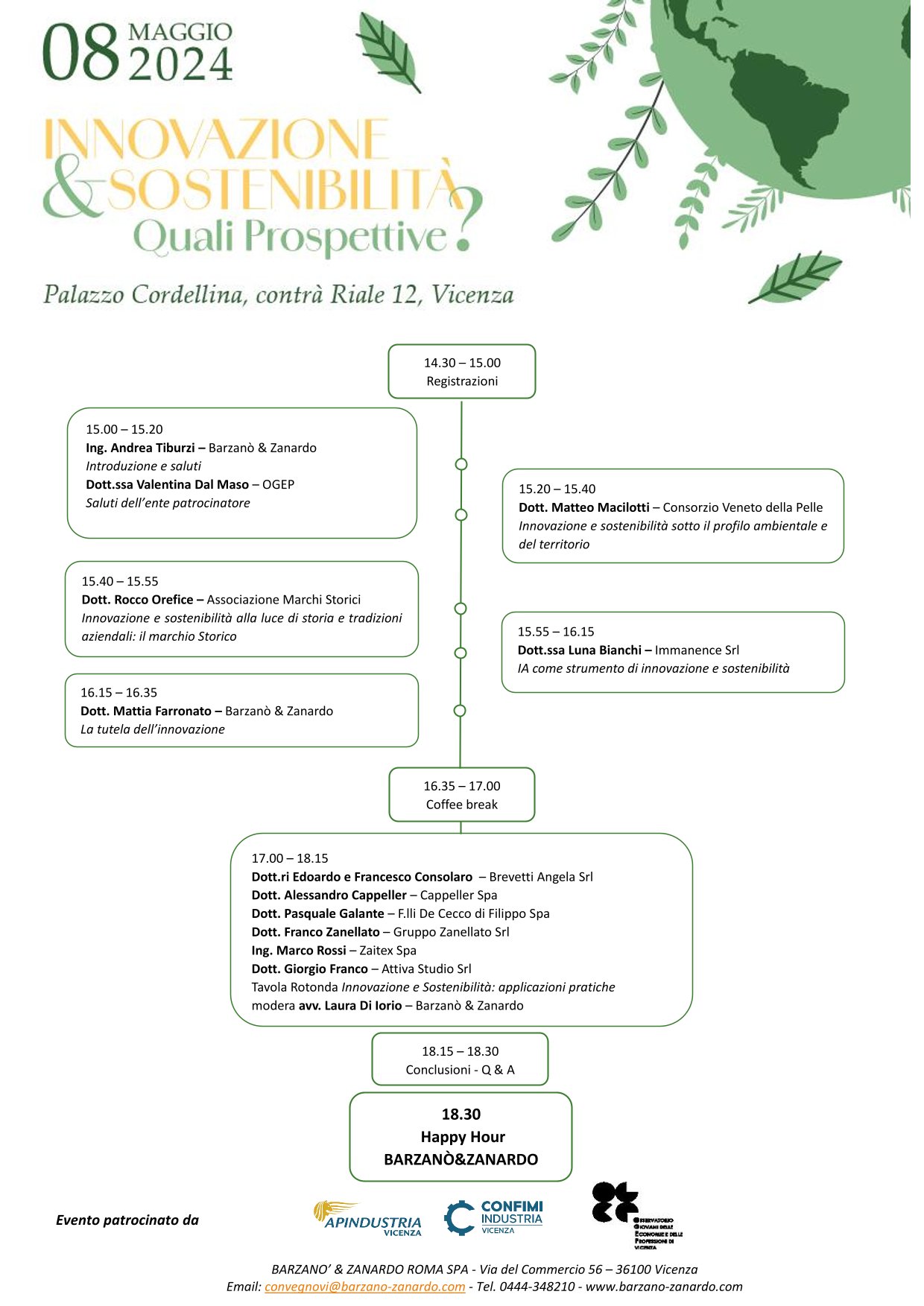 Nella prima parte del convegno, quindi, ascolteremo i diversi punti di vista offerti dai relatori, che saranno introdotti dal dott. Andrea Reggio, consulente marchi BZ: il dott. Matteo Macilotti in qualità di Direttore del Distretto Veneto della Pelle, ossia un consorzio di oltre 600 aziende che aggrega tutte le realtà della filiera della pelle veneta (concia, chimica, meccanica, riciclo e servizi), il dott. Rocco Orefice in qualità di Direttore dell’Associazione Marchi Storici, la dott.ssa Luna Bianchi, in qualità di A.D. della società Immanence e il dott. Mattia Farronato, consulente brevetti BZ.